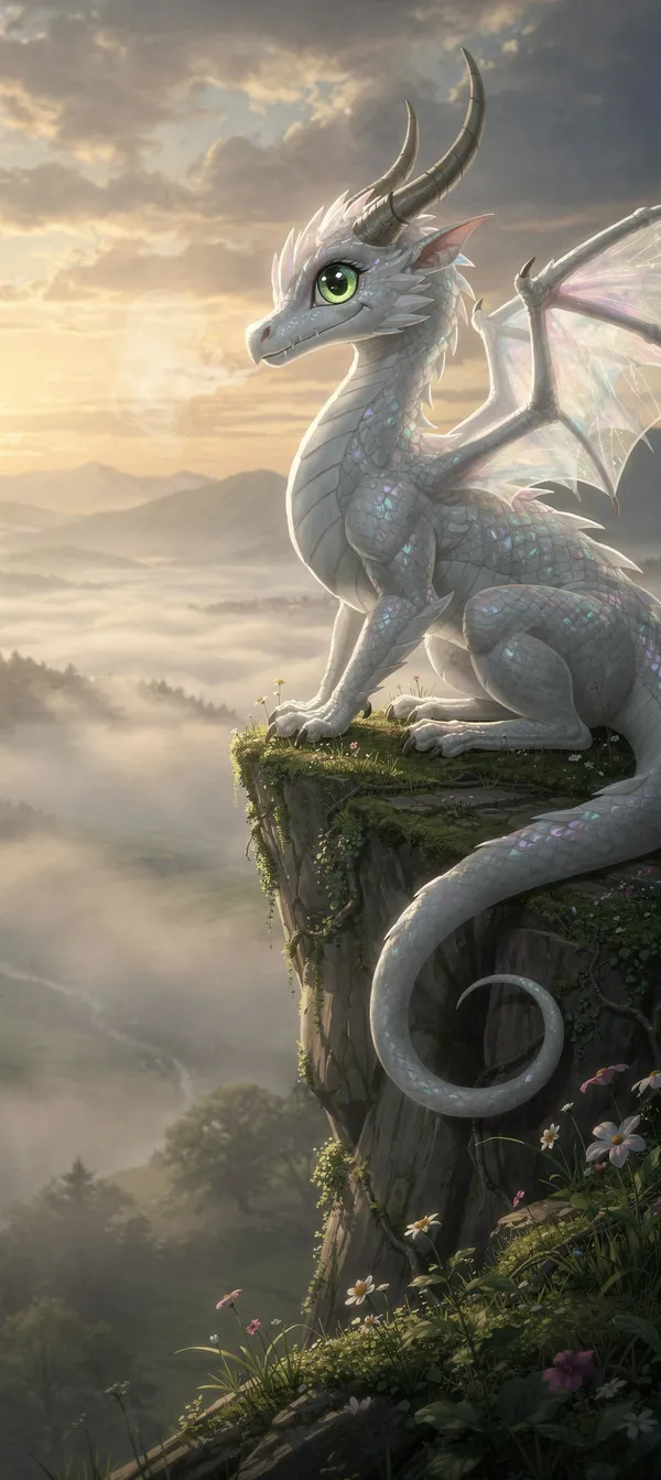 FantasyStunning 4K fantasy wallpaper featuring a majestic white dragon with emerald eyes perched on a misty cliff, ideal for phone backgrounds with epic mythical detail.