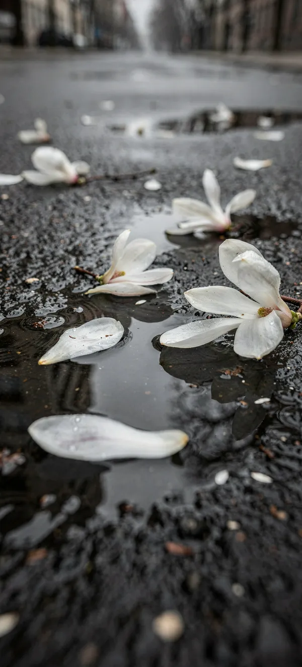 FlowersElegant artistic wallpaper featuring delicate white magnolia petals scattered on wet dark pavement with soft urban reflections and moody overcast lighting.