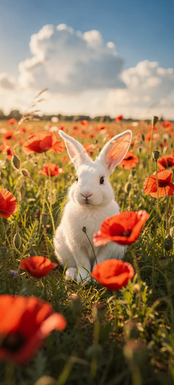 Serene nature phone wallpaper featuring a white rabbit among vibrant red poppies under a blue sky. High-quality pastoral landscape background for mobile.