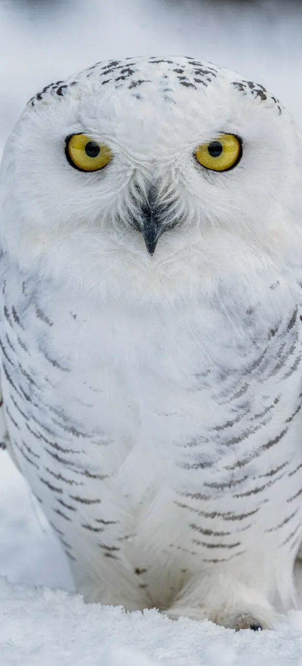 Ultra-realistic white snowy owl phone wallpaper with piercing yellow eyes. High-definition wildlife photography background for nature lovers.