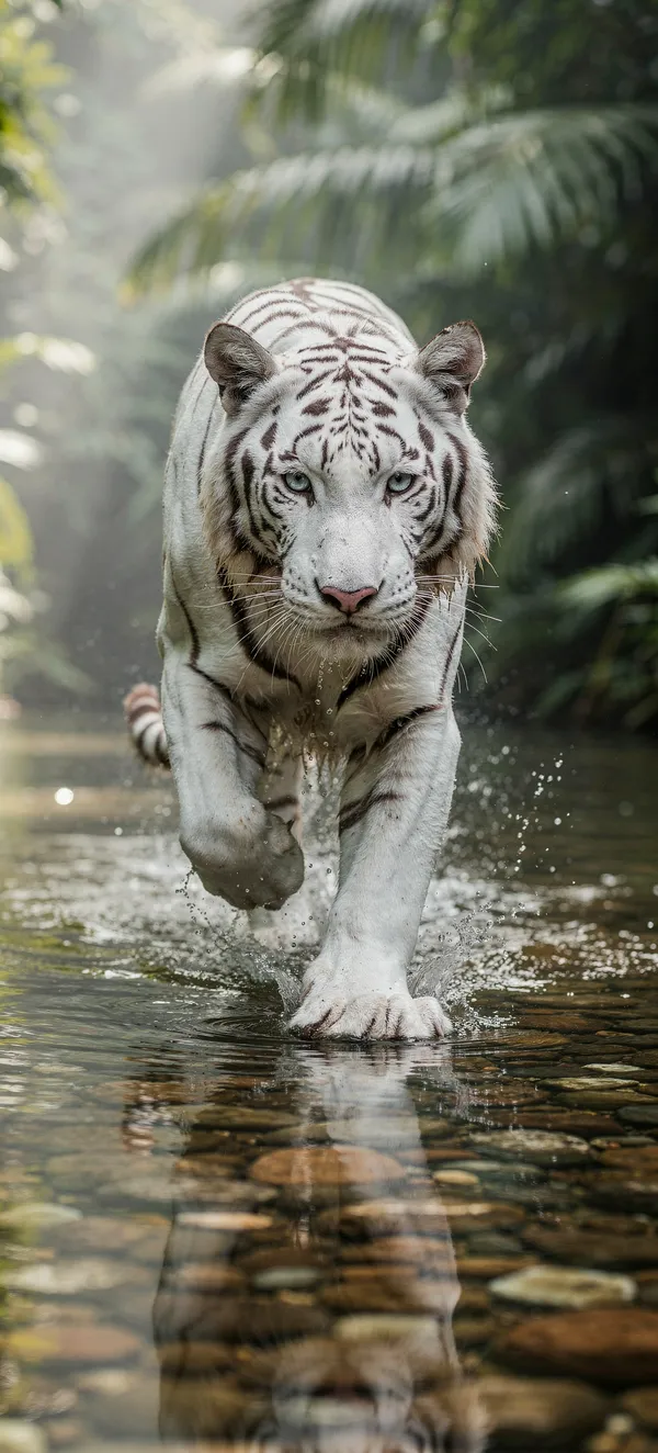 AnimalsStunning high-resolution white tiger wallpaper with crystal clear water reflection, powerful jungle scene in vibrant green and icy blue tones for mobile backgrounds.