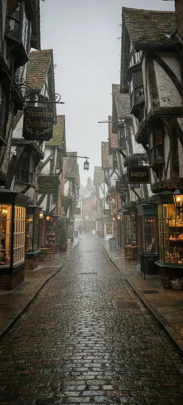 Discover a stunning 4K wallpaper of York's historic Shambles, featuring medieval timber-framed houses and charming cobblestone lanes in soft, atmospheric light.