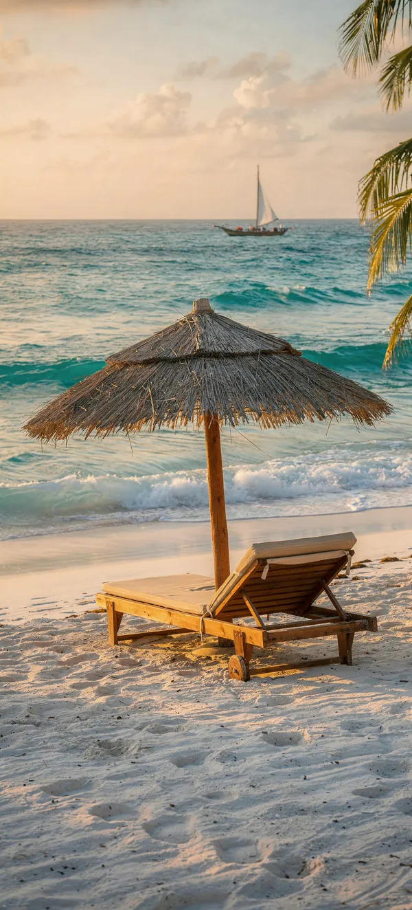 Tranquil Zanzibar beach scene with sun lounger, straw umbrella, and turquoise waters. High-resolution tropical landscape mobile background.