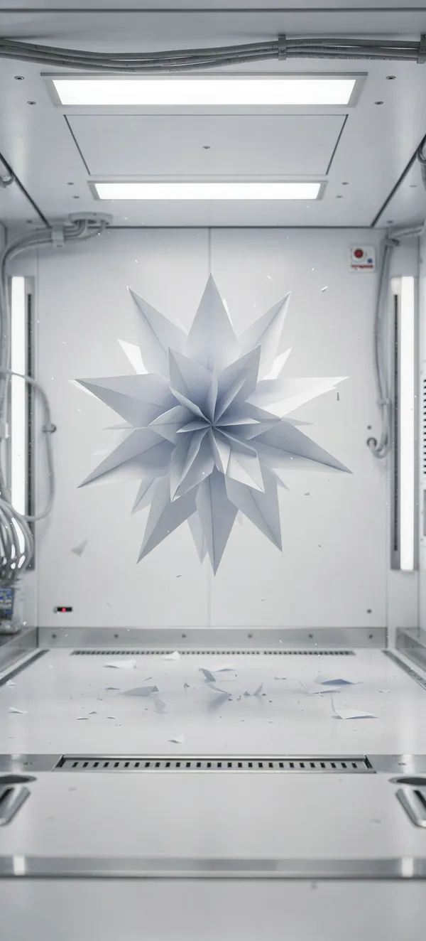 Stunning minimalist scientific wallpaper featuring intricate origami-style paper flower in zero-gravity lab with soft LED lighting and geometric precision.